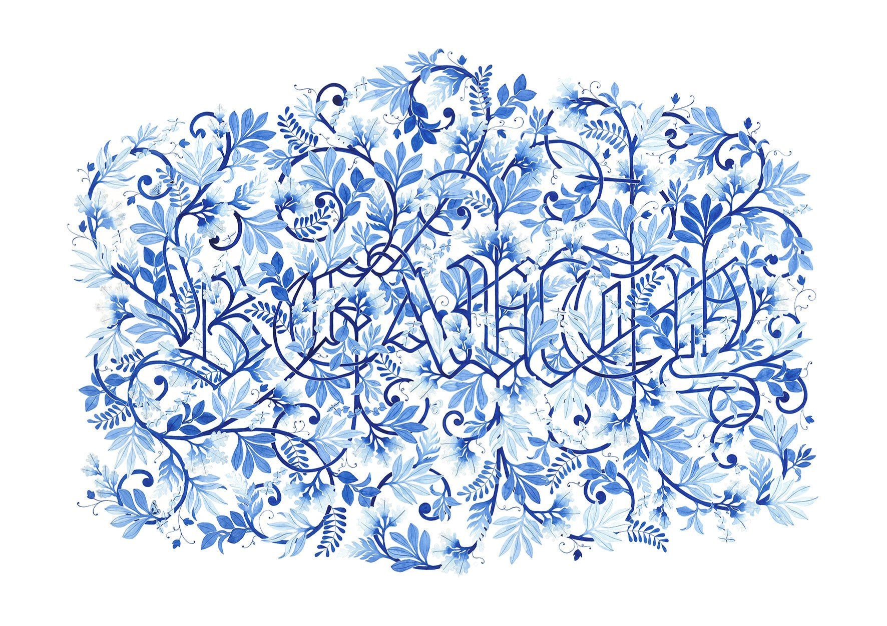 Beauty interlaced in foliage; oak and cherry blossom leaves, fern fronds and butterflies allude to more.