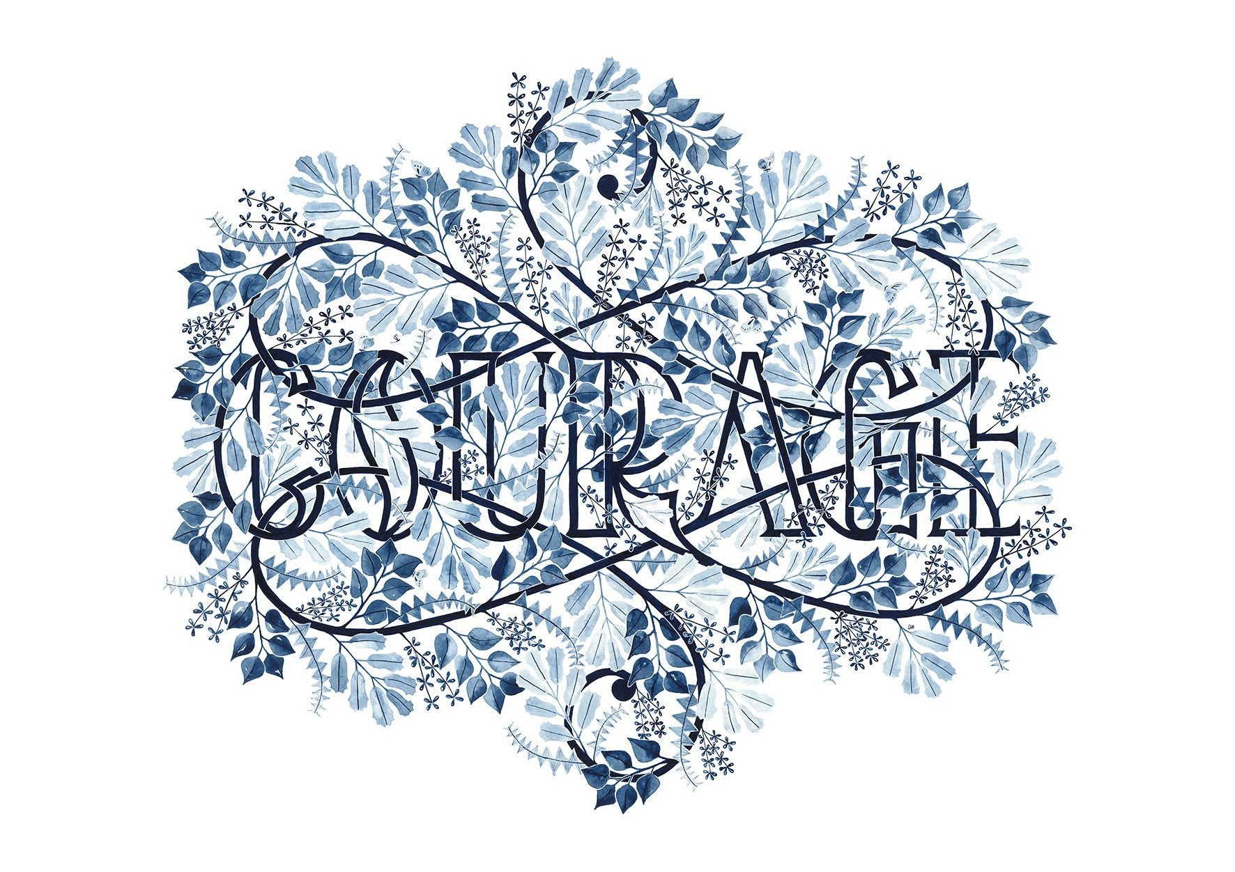 Courage interlaced in foliage; protea and thyme leaves and butterflies allude to more.