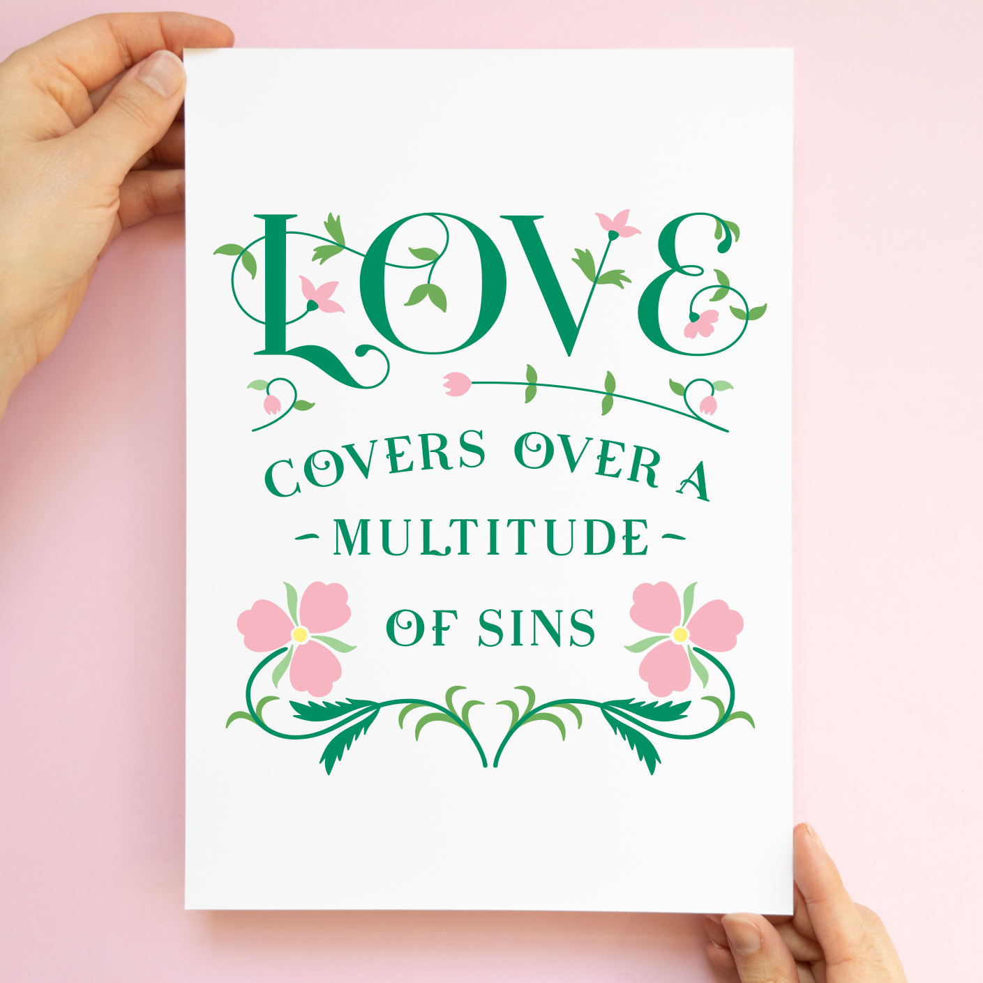 A hand lettered wall art piece, designed as a reminder to love each other with that sin covering love that God shows us.