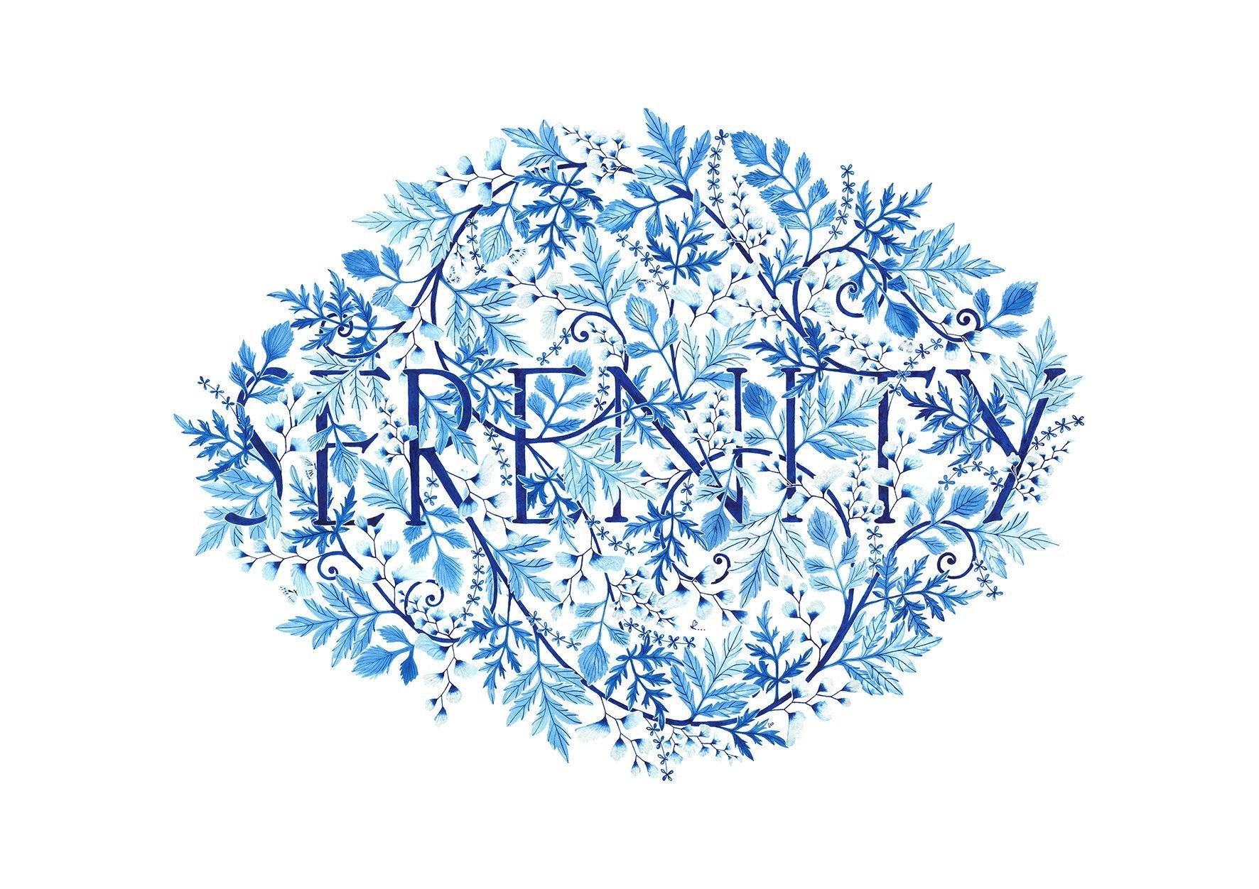 Serenity interlaced in foliage; dahlia leaves, maidenhair fronds and butterflies allude to more.